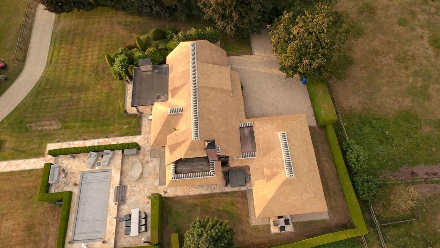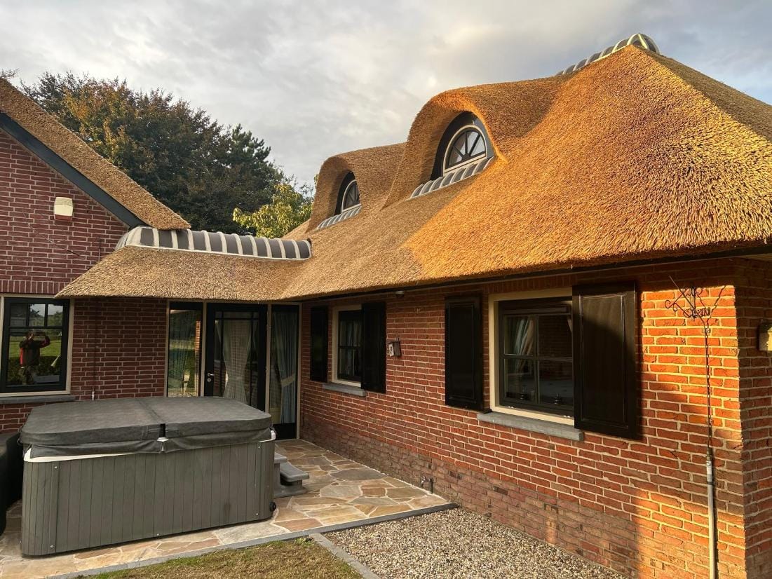 Deze villa heeft door de nieuwe rieten kap een vorstelijke en warme uitstraling gekregen. Met uiterste precisie hebben wij het riet gemodelleerd rond de complexe daklijnen en dakkapellen, wat zorgt voor een vloeiend en harmonieus geheel. Een meesterwerk in natuurriet dat staat voor luxe, duurzaamheid en een uniek karakter.